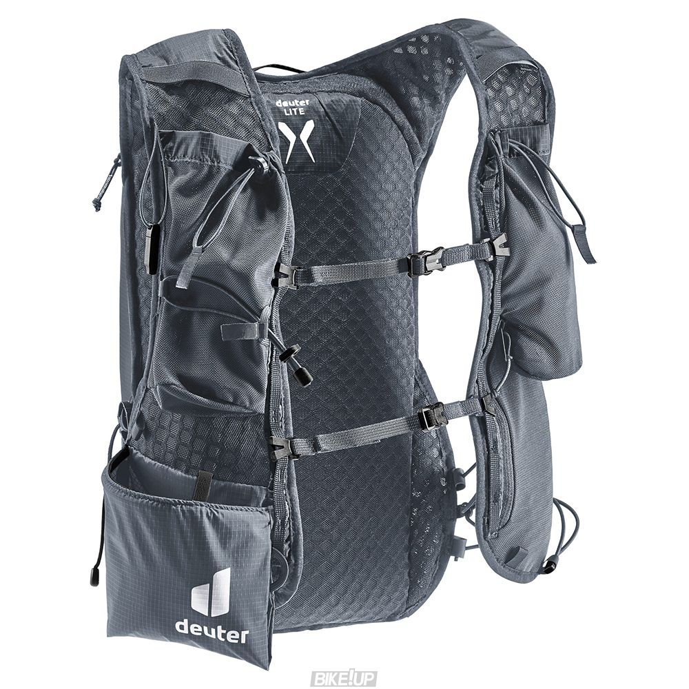 Ultra-lightweight and super comfortable: wide, ergonomic vest-style shoulder straps with elasticated compression system, two adjustable sternum straps and soft material against the back create a garment-like fit. A stretch mesh inner pocket and side compression straps help eliminate load wobble no matter how challenging the terrain. A holster pocket on the front of one shoulder strap makes it quick and easy to access collapsible trekking poles. And there is space for soft flasks and a GPS in the shoulder strap pockets. The body fabric is made from 100% recycled materials and is bluesign® certified.