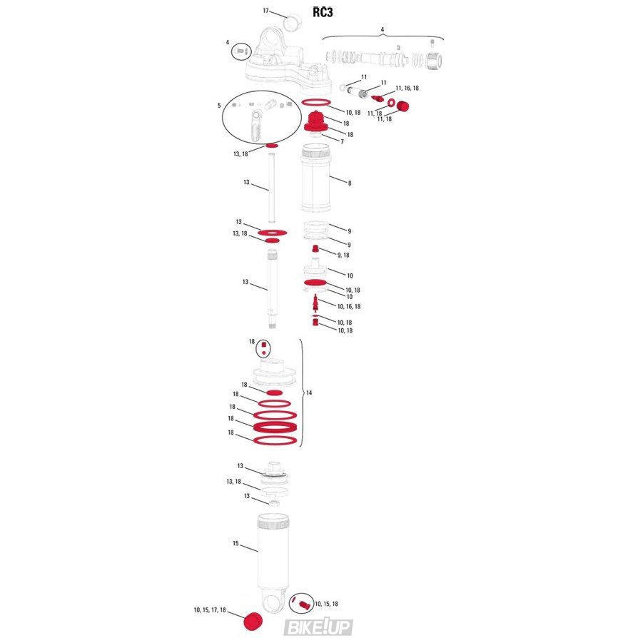 Service kit includes all spare parts (without air can seals) for the service of RockShox Monarch and Monarch Plus rear shocks model year 2011 - 2013.